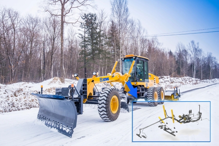 徐工平地機(jī)為高效除雪打造了專用除雪輔具:前部推雪板能快速清除積雪和浮雪,中部鏟刀兼?zhèn)涑┡c破冰功能,后部滾雪刷能將積雪掃到路沿,快速除雪保證道路通暢。