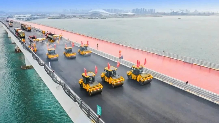 翔安大橋在建設(shè)中既要克服海上風浪大、潮差高、巖層強度高、跨越生態(tài)保護區(qū)等困難,又要兼顧綠色環(huán)保;要在這種復雜的環(huán)境中保證施工質(zhì)量,對設(shè)備和施工技術(shù)的選擇就顯得尤為重要。徐工數(shù)字化智能施工集群憑借其智能化、高精度、高效率等顯著優(yōu)勢,成功克服了傳統(tǒng)施工方式難以應(yīng)對的諸多難題,可精準適配翔安大橋的橋面鋪裝工作。