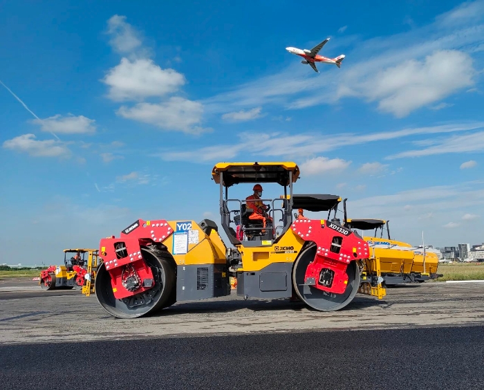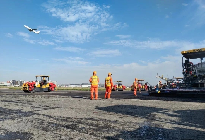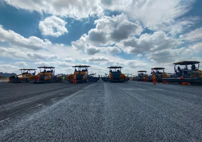 想象一下,航班在西跑道頻繁起降的同時,數(shù)百名施工人員和數(shù)百輛設(shè)備,就在幾百米外忙碌作業(yè)。施工挑戰(zhàn),前所未有的嚴峻。傳奇,在這短暫的15天一一上演。不過,這傳奇的紙簿上,亦被烙上“徐工金”的身影。徐工成套道路機械,在此項高難度施工中,迎難而上、挑起重擔。