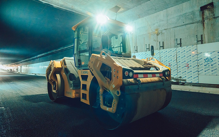 某隧道數(shù)字化智能施工是國內(nèi)首次在城市地下長隧道中進行無人攤鋪、壓實新工藝應(yīng)用。擔(dān)任壓實工作的也正是徐工XD135TIV壓路機,在狹窄的作業(yè)空間內(nèi)展現(xiàn)出強大的施工能力。它的起步平緩和停車平穩(wěn)的設(shè)計,有效避免了路面堆料和擁包現(xiàn)象,確保了每一段路面的高質(zhì)量壓實,節(jié)省了大量時間和成本。