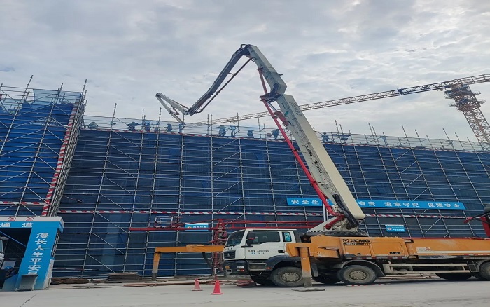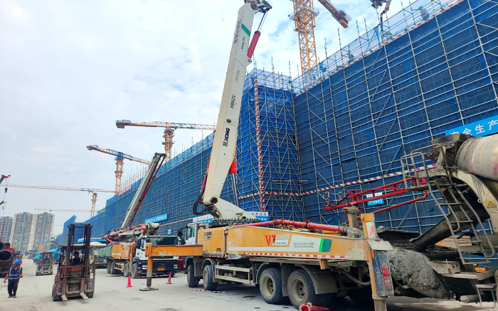 施工現場,臂架林立、機器運轉,徐工成套混凝土機械聯袂出擊,新能源攪拌車、車載泵、泵車齊上陣,從混凝土運輸、泵送施工、服務保障等方面守護項目順利進行。