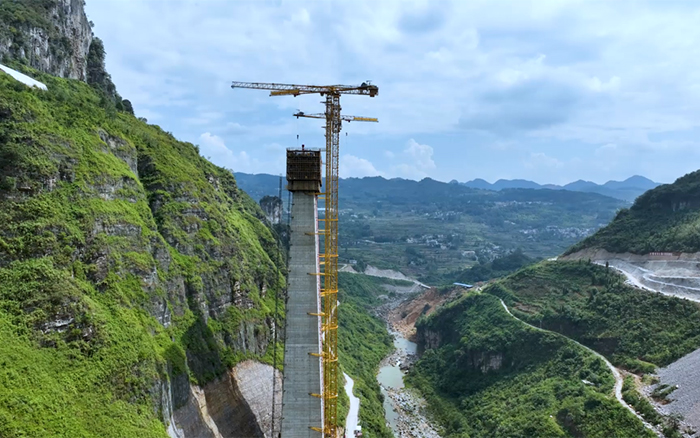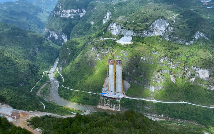 金旗特大橋是世界上目前在建最高的深山峽谷連體斜拉橋,主塔總高度達(dá)300.5米,施工區(qū)域多喀斯特地貌,地下巖層脆弱、兩岸山體陡峭、施工區(qū)域狹窄、轉(zhuǎn)運(yùn)困難,其長(zhǎng)度、塔柱高度、施工區(qū)域地形地貌均為國(guó)內(nèi)罕見(jiàn)的高難度。