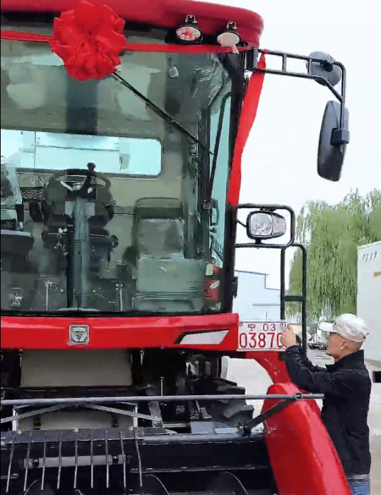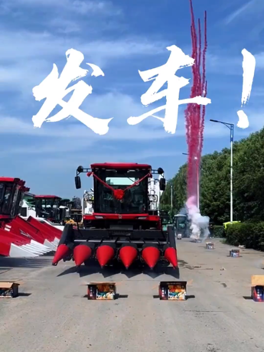 提車現(xiàn)場,禮花鞭炮齊鳴,身披大紅花的玉米收獲機(jī)整齊排列,一臺(tái)接一臺(tái)奔赴田間地頭,即將逐夢沃野,繪就豐收圖景。