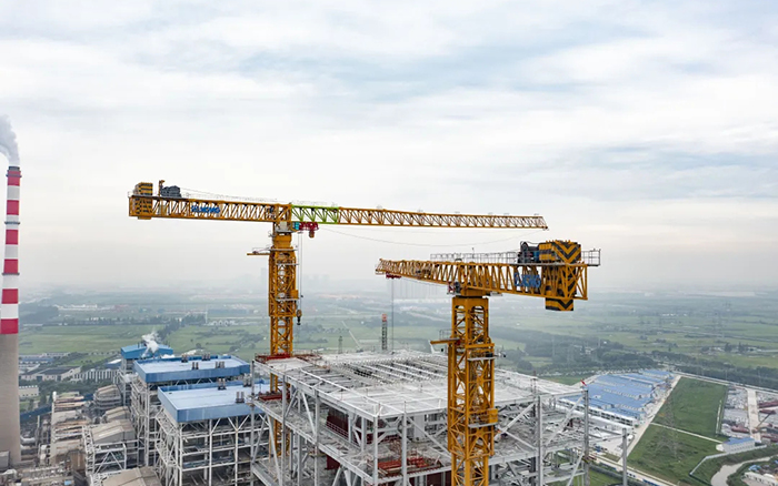 側望長江畔,機器轟鳴、江水潺潺,華能太倉電廠機組擴建項目施工現場一派繁忙景象,XGT3100-160S、XGT1350-64S兩臺徐工超大塔穩(wěn)穩(wěn)矗立在高聳的鋼架間吊裝作業(yè)。