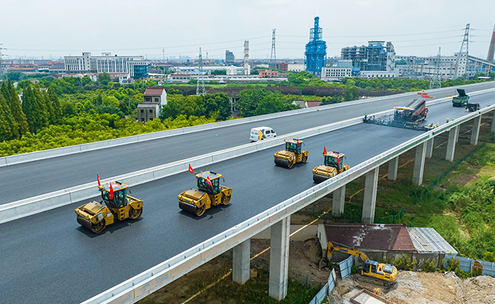常泰長(zhǎng)江大橋大寬度整幅面層的“一鍵鋪平”,也備受矚目。進(jìn)行此次攤鋪工作的是徐工自主研發(fā)的大米數(shù)攤鋪機(jī)和13噸雙鋼輪壓路機(jī),攤鋪寬度15m,厚度4cm,屬于大寬度的整幅面層攤鋪,實(shí)現(xiàn)施工效率、橋面平整度雙提升。鋪裝工程涵蓋了橋面、主路、匝道等多個(gè)施工場(chǎng)景,充分體現(xiàn)出徐工設(shè)備的廣泛適用性和靈活性。無論是寬闊的主橋面,還是復(fù)雜的匝道區(qū)域,都能實(shí)現(xiàn)高質(zhì)量的整幅面層攤鋪。