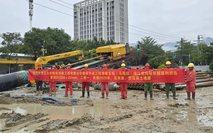 本次工程需穿越閩江,穿越距離長,地層條件復雜,淤泥與花崗巖交錯,施工難度系數(shù)大,此前,該項穿越工程因設(shè)備能力等原因停滯長達4年之久。施工過程中,徐工XZE8200起步回拖最大推拉力達到370t,最大扭矩90kN·m,全程高效施工,順利完成回拖,贏得了客戶和工程項目部的高度認可。