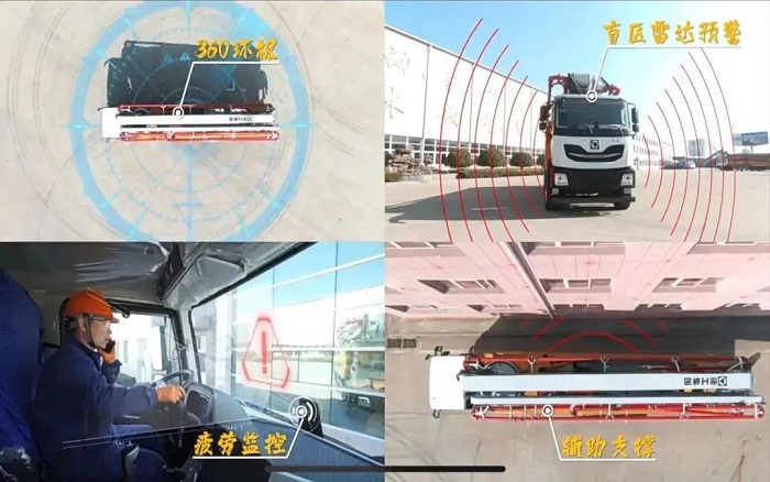 車身同時配有盲區(qū)雷達預警、360環(huán)視等輔助駕駛系統(tǒng),提升泵車駕駛安全系數(shù),行車更安心。