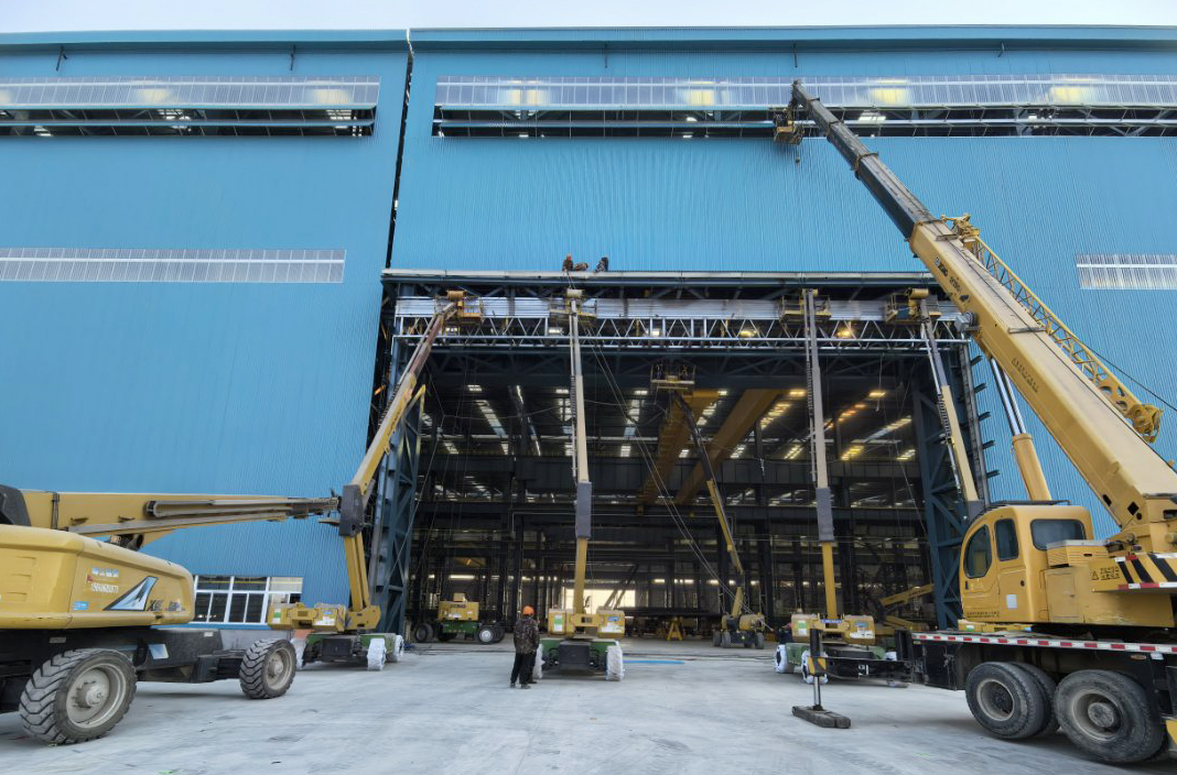 在恒力重工三期廠房建設(shè)工地,近10臺(tái)30米級(jí)徐工高空作業(yè)平臺(tái)正大顯身手,忙碌于車間內(nèi)外鋼結(jié)構(gòu)建設(shè)與墻面裝飾等精細(xì)作業(yè)。