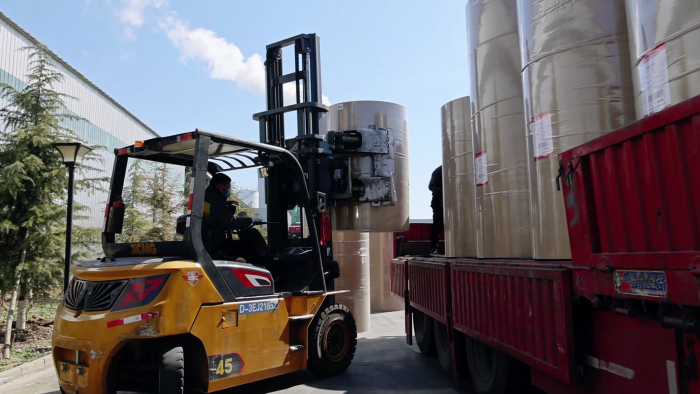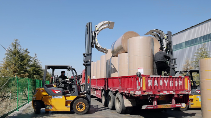 十幾臺(tái)徐工孔雀系列電動(dòng)平衡重叉車搭配紙卷夾屬具穿梭忙碌