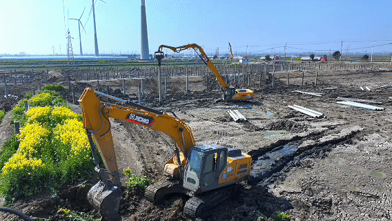 在揚(yáng)州178兆瓦光伏施工現(xiàn)場(chǎng),徐工XE300GP打樁機(jī)正演繹著現(xiàn)代工程機(jī)械的超強(qiáng)實(shí)力——機(jī)械臂精準(zhǔn)起落間,10米預(yù)制樁以平均57s/根的節(jié)奏植入地層,樁基垂直度監(jiān)測(cè)儀實(shí)時(shí)顯示±5厘米的精度數(shù)據(jù)。