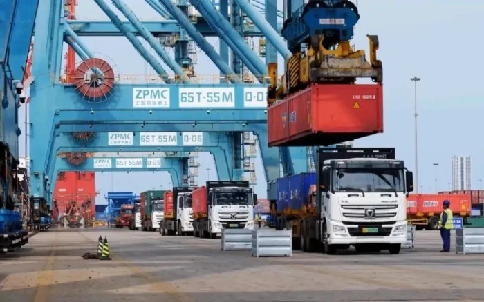巨輪泊岸,裝船機(jī)臂展如虹,一輛輛身披晨光的徐工新能源重卡,在碼頭前沿與堆場間穿梭不息,織就一幅物流奔騰、經(jīng)濟(jì)躍動(dòng)的壯闊圖景。