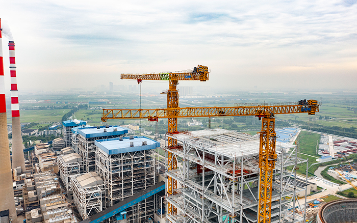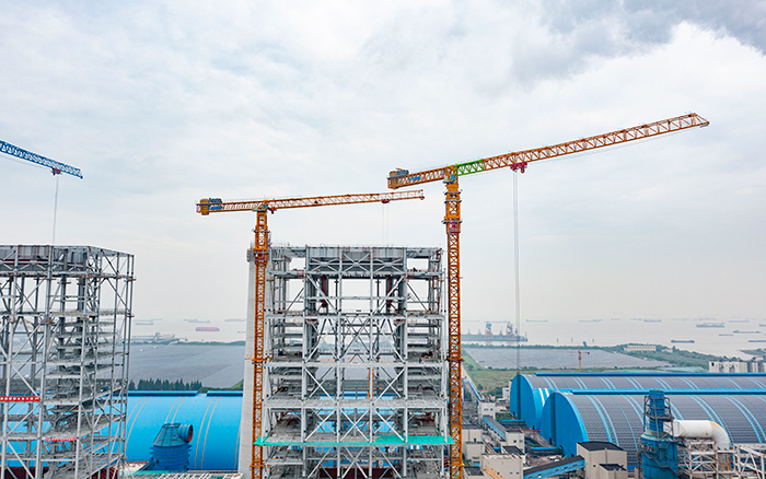 側(cè)望長江畔,機(jī)器轟鳴、江水潺潺,華能太倉電廠機(jī)組擴(kuò)建項(xiàng)目施工現(xiàn)場一派繁忙景象,XGT3100-160S、XGT1350-64S兩臺徐工超大塔穩(wěn)穩(wěn)矗立在高聳的鋼架間吊裝作業(yè)。