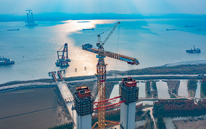 張靖皋長(zhǎng)江大橋主跨為2300米,索塔高度為350米,擁有跨度、索塔高度、錨碇體積等6個(gè)世界第一,是中國橋梁首次突破2000米跨徑標(biāo)志性橋梁。