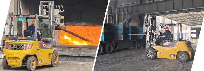 不止新疆,在華東某大型冶金廠,孔雀4.5噸叉車正在進行爐前作業(yè);在華南電解鋁行業(yè)的強磁車間內(nèi),5噸孔雀叉車在進行原材料搬運工作。