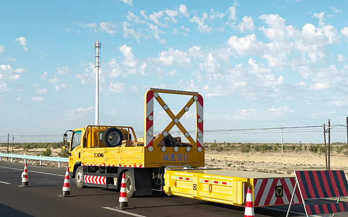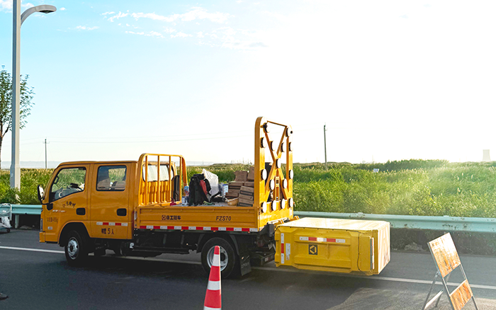 不光是安全衛(wèi)士,它們還是高效的 “移動(dòng)倉(cāng)庫(kù)”。貨箱敞開著,里面整齊碼放著鐵鍬、瀝青、警示錐等施工所需的工具和材料。施工時(shí),人員無(wú)需來(lái)回奔波取物,伸手就能拿到需要的東西,讓施工節(jié)奏得以加快,省去了不少麻煩。當(dāng)施工收尾,防撞緩沖車駛離后,留下的不僅是平整的路面,更有它們?yōu)檫@次施工全程護(hù)航的印記。
