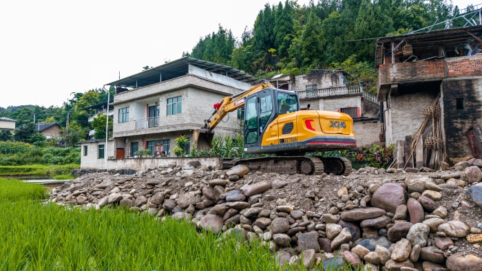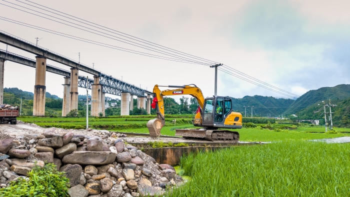雨季施工,場(chǎng)地濕滑狹窄,對(duì)設(shè)備靈活性、可靠性和機(jī)手技術(shù)都是嚴(yán)峻的考驗(yàn)。在這片泥濘的稻田邊、陡峭的坡地上,身披“徐工金”的XE75GA挖掘機(jī),正化身開(kāi)路先鋒,為苗鄉(xiāng)新居夯下第一塊基石。