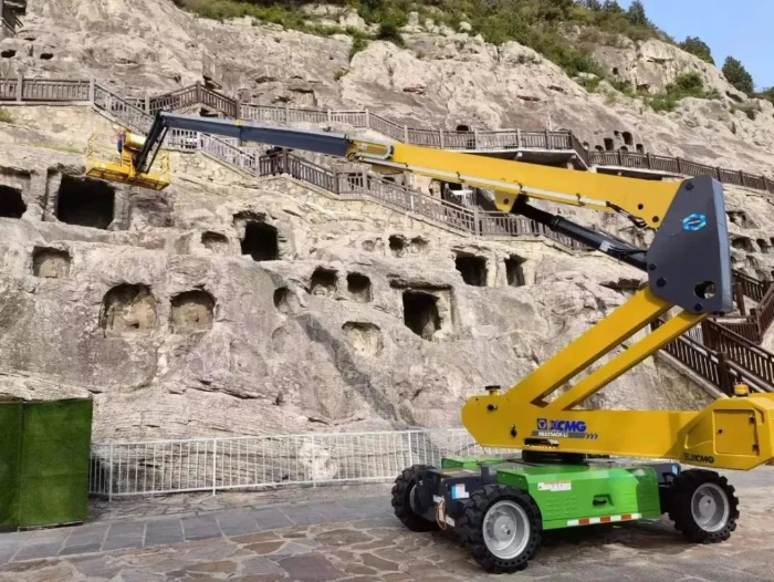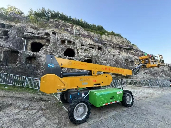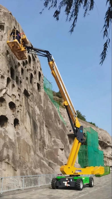 時間回溯到2021年,由于遭受多場暴雨侵襲,龍門石窟部分洞窟內滲漏水嚴重甚至出現積水,部分山體表面巖石脫落、松動,嚴重威脅文物安全,急需得到有效治理。龍門石窟研究院隨即開展了為期1年多的“龍門石窟蓮花洞至石牛溪區(qū)域保養(yǎng)維護項目”。徐工XGS25ACK-Li直臂式高空作業(yè)平臺作為“得力助手”,深度參與各項保護修復工作。