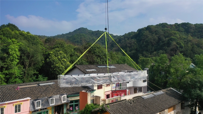 在杭州大清谷影視拍攝基地,一場(chǎng)“靜默式”吊裝正在上演。全球首款四橋八節(jié)臂130噸汽車(chē)起重機(jī)——徐工G2代XCT130G8-1,將20米長(zhǎng)、2.5噸重的劇組燈架穩(wěn)穩(wěn)送至跨度46米外的房屋上空。而這一“定格”,就是整整三天。