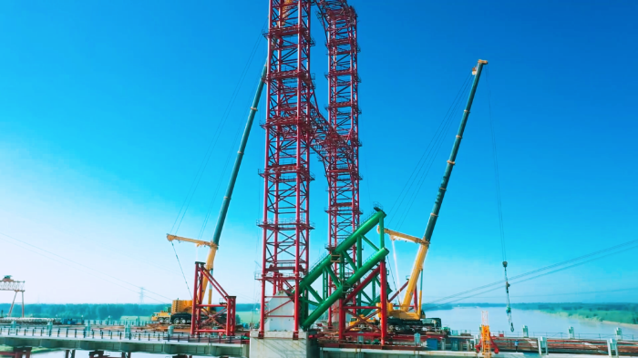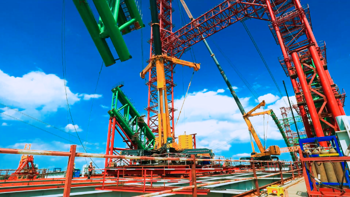 該黃河特大橋是目前國內(nèi)規(guī)模最大的下承式鋼管混凝土系桿拱橋,作為架起拱橋主拱圈“骨架”——拱肋的主力,徐工起重機(jī)是如何架起“彩虹”的呢?