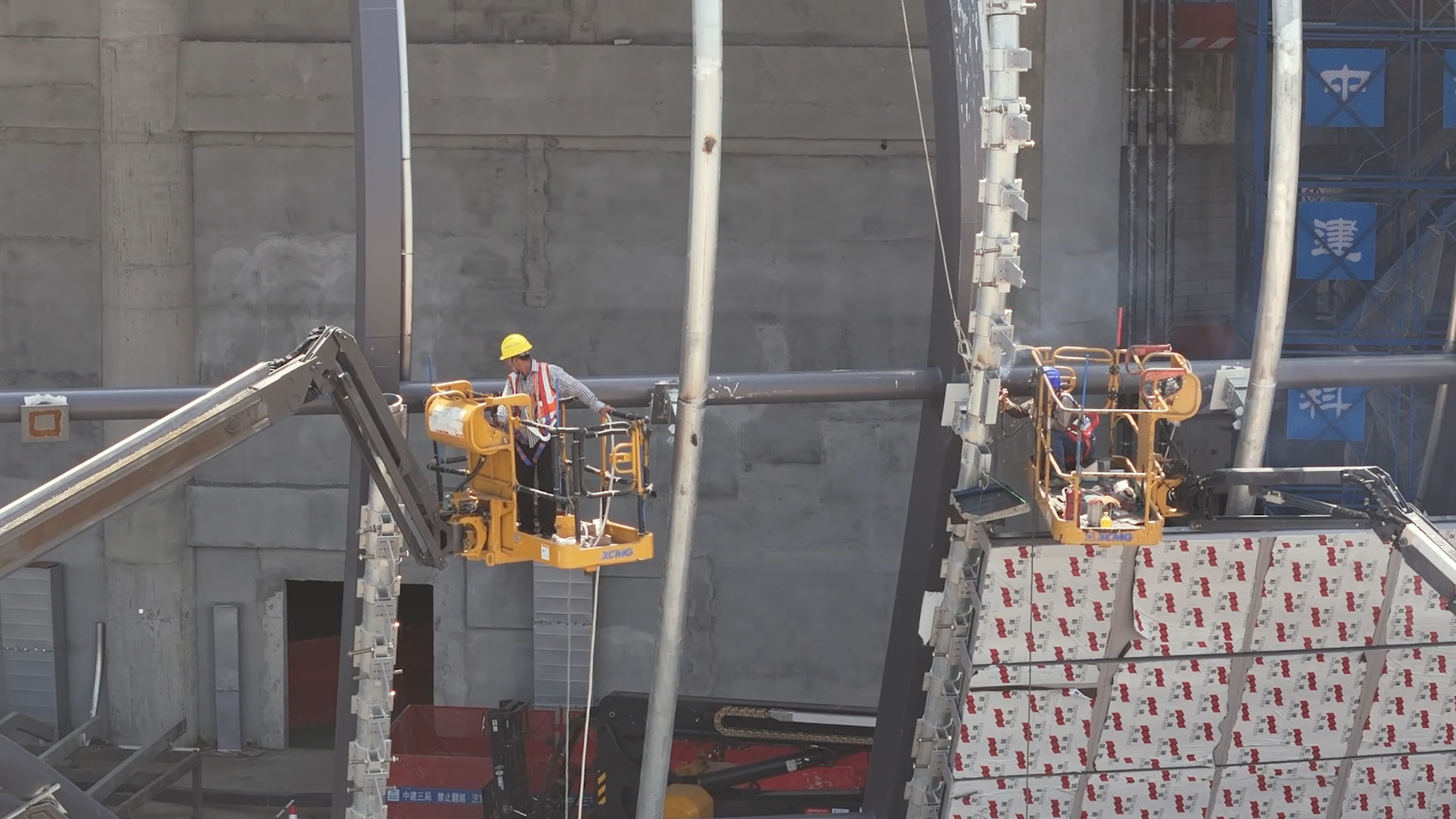 南沙體育館整體結構為圓形,焊接點比較復雜,一般車輛臂展無法直接抵達施工點。徐工高米級直臂車自帶的曲臂伸縮及曲臂回轉大大增加了車輛的越障能力,更方便工人作業(yè),收獲現(xiàn)場工人的一致好評。