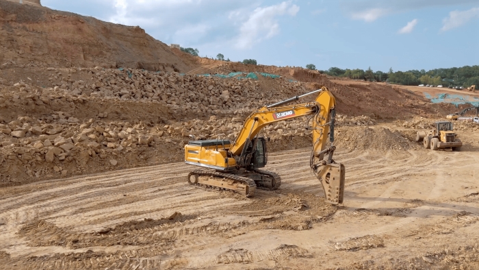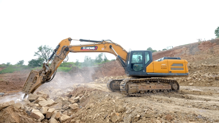 徐工挖掘機(jī)打破碎很有勁,駕駛舒適。我們?cè)谶@個(gè)項(xiàng)目上主要做巨石破碎工作,徐工的設(shè)備在回轉(zhuǎn)、破碎等動(dòng)作上都表現(xiàn)的很優(yōu)秀,屬具更換很便捷,底盤(pán)比其他品牌的同噸位設(shè)備都要穩(wěn)。