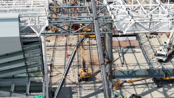 以徐工XGS40K為代表的十余臺(tái)徐工高機(jī)有的“一枝獨(dú)秀”,平穩(wěn)變幅直指站房屋頂;有的精準(zhǔn)定位,靈活探入桁架之間緊貼焊接點(diǎn),成為保障鋼桁架高空焊接作業(yè)的主力軍,熱火朝天的為祖國(guó)交通樞紐建設(shè)貢獻(xiàn)力量。