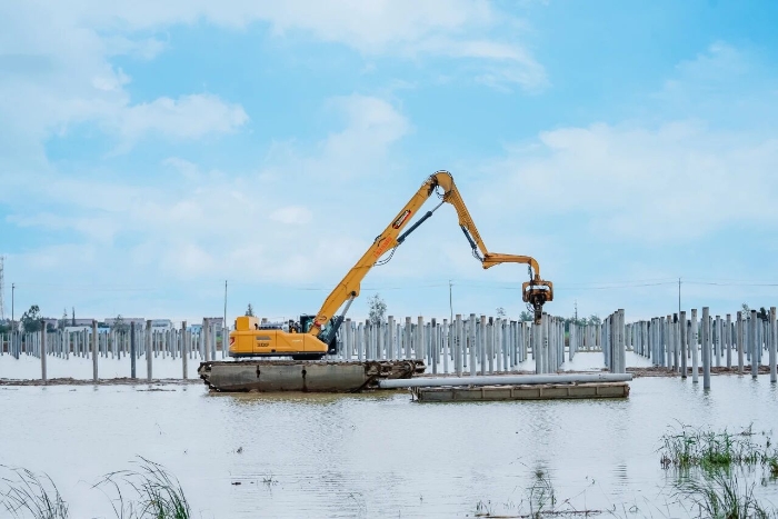 憑借精準(zhǔn)的操控、連貫的動(dòng)作以及強(qiáng)勁的動(dòng)力,它們將一根根10多米長的混凝土預(yù)制樁準(zhǔn)確無誤地壓入指定的位置,為后續(xù)支架、組件、發(fā)電板安裝等關(guān)鍵環(huán)節(jié)的有序推進(jìn)“保駕護(hù)航”。