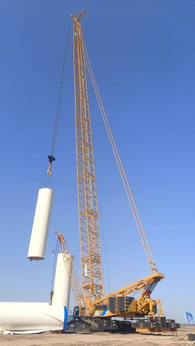 近日,在我國西北某風電場,徐工XLC15000(1000噸級)履帶起重機,以132+12米標準風電工況,精準將重達34噸的風機葉片平穩(wěn)吊裝至百米高空,圓滿完成10兆瓦風機吊裝任務。